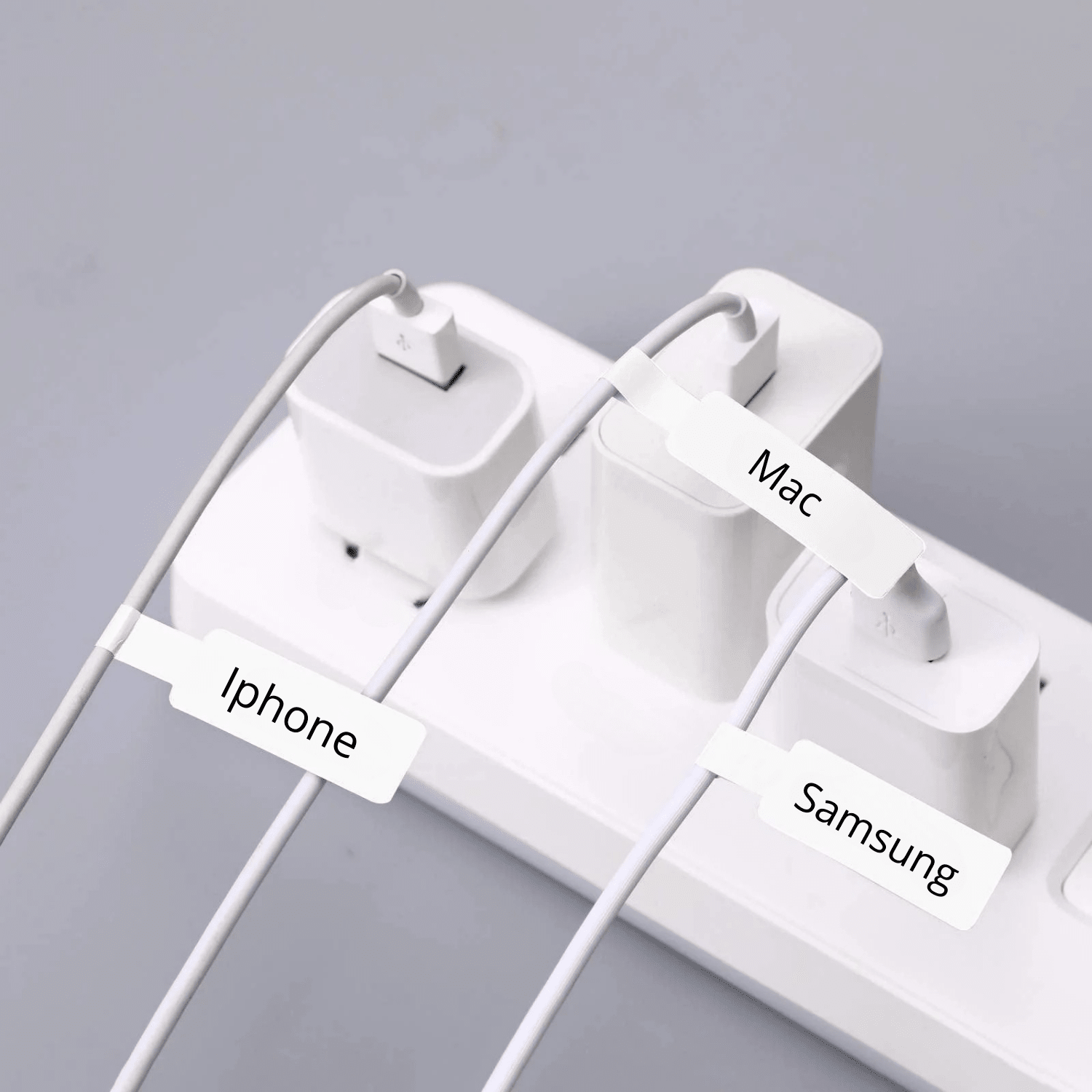 Smarta kabeletiketter i praktiskt format 25 × 38+40 mm, särskilt utformade för tydlig märkning av kablar och sladdar.
